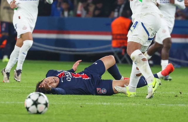 파리 생제르맹(PSG) 이강인이 지난 10월 23일 새벽(한국시간) 프랑스 파리의 파르크 데 프랭스 경기장에서 열린 2024-25 유럽축구연맹(UEFA) 챔피언스리그(UCL) 페이즈 3차전 PSV 에인트호번(네덜란드)과의 홈 경기에서 공에 밀려 넘어지고 있다 / 뉴스1