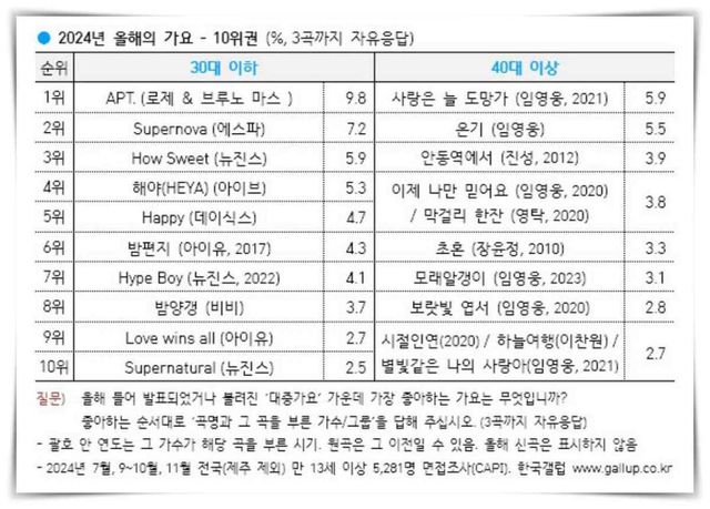 2024년 올해를 빛낸 가요. / 한국갤럽 제공