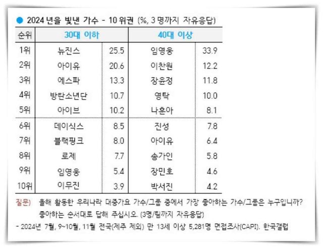 30대 이하 응답자 중 올해의 가수 1위는 걸그룹 뉴진스가 25.5% 지지를 받아 2년 연속 1위를 차지했다. 뉴진스는 2022년 데뷔 이후 빠르게 성장하며 K팝의 새로운 강자로 자리매김했다. 이어 아이유가 20.6%로 2위를, 걸그룹 에스파(aespa)가 13.3%로 3위를 기록했다. 방탄소년단(BTS)이 10.7%로 4위를, 아이브(IVE)가 10.2%로 5위를 차지하며 상위권을 형성했다.