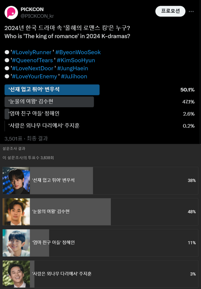 최근 픽콘이 공식 유튜브 채널과 X(구 트위터)를 통해 '2024년 한국 드라마 속 '올해의 로맨스 킹'은 누구?'이라는 주제로 투표를 진행했다. 12월 5일부터 12월 11일까지 진행된 이번 조사에는 총 7,339명(유튜브 커뮤니티 3,838명, X 3,501명)의 네티즌이 참여했다.