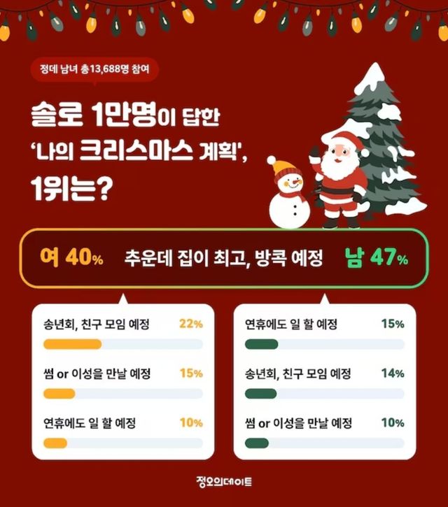소셜 데이팅 앱 정오의데이트는 미혼 남녀를 대상으로 실시한 ‘나의 크리스마스 계획은?’ 설문조사 결과를 23일 공개했다. 이 조사는 1만 3688명이 참여했다.