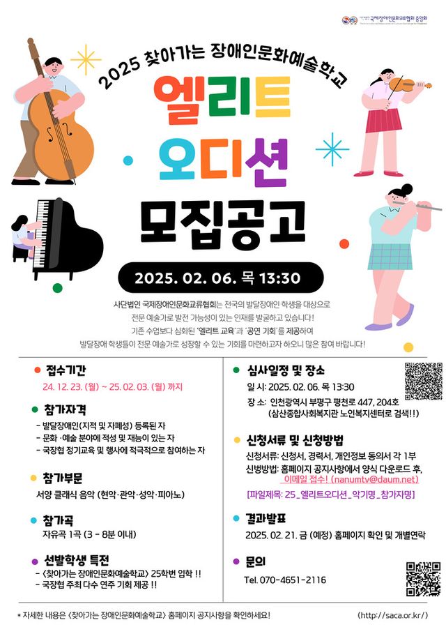 사단법인 국제장애인문화교류협회 중앙회(이하 국장협, 이사장 최공열)가 주최·주관, 문화체육관광부, 국민체육진흥공단, (재)한국장애인문화예술원의 후원으로 2025년 02월 06일에 <찾아가는 장애인문화예술학교>의 ‘엘리트 오디션’을 국장협 부평문화예술학교 교육실에서 개최한다.본 오디션은 전국 각 지역의 발달장애인 학생을 대상으로 하며, 이들의 예술적 잠재력을 발굴하고, 전문 예술인으로 성장할 기회를 제공하기 위해 기획되었다. 접수는 2024년 12월 23일(월)부터 2025년 02월 03일(월)까지 진행하며, 서류와 실기 심사로 이루어진다.