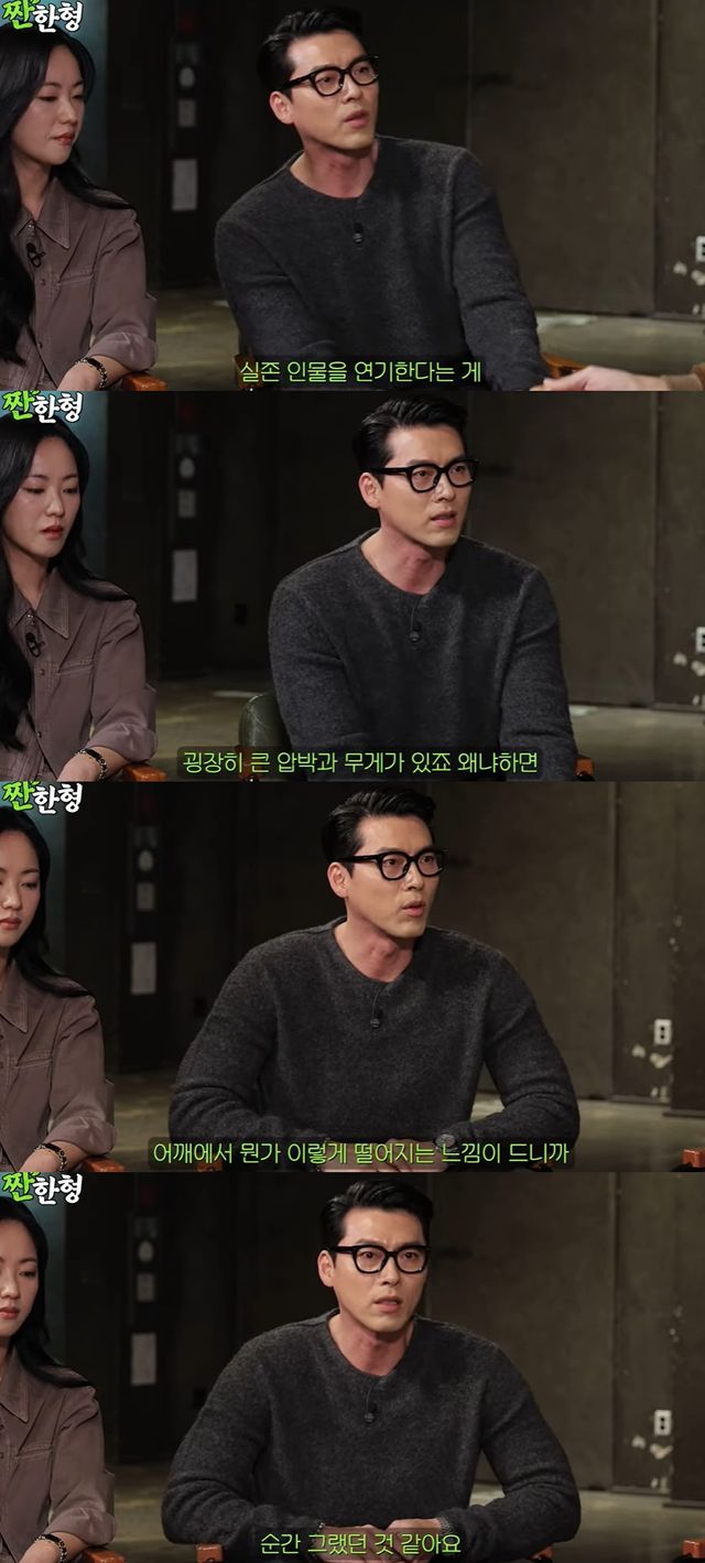 이를 들은 현빈은 "실존 인물을 연기한다는 게 굉장히 큰 압박과 무게가 있다"며 "많은 분이 특히 더 아는 분일수록, 상징성이 있는 분일수록 크다. 끝나고나서 순간 어깨에서 뭔가 이렇게 떨어지는 느낌이 들었다"고 압박감에 시달렸던 심정을 전했다.