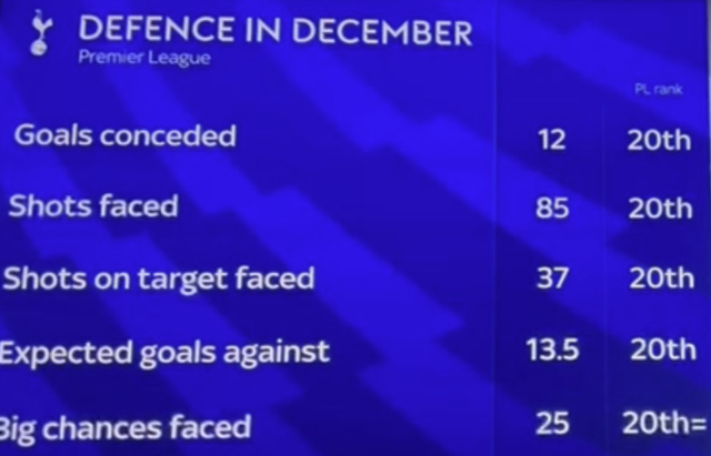 홈에서 선두 리버풀과 맞불 작전을 놨다가 치욕적인 3-6 대패를 겪은 토트넘이 잉글리시 프리미어리그에서 가장 많은 경기가 올린 12월에 5개 분야에서 꼴찌를 달리는 것으로 드러났다. 수비와 관련된 지표들인데 처참할 정도의 수치다.