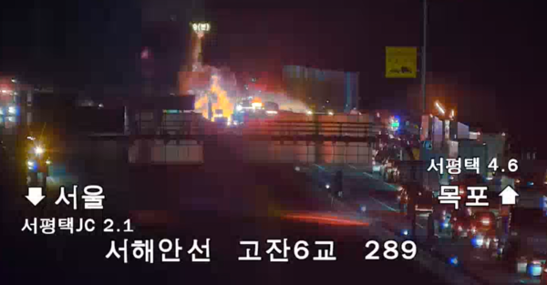 23일 한국도로공사에 따르면 이날 오후 9시 56분 경 서해안선 288.7km 목포방향(평택시 홍원리 938-5일원 서해안고속도로 상행) 유조차에서 큰불이 났다. 해당 차량엔 3만ℓ의 기름이 저장돼 있던 것으로 전해졌다.