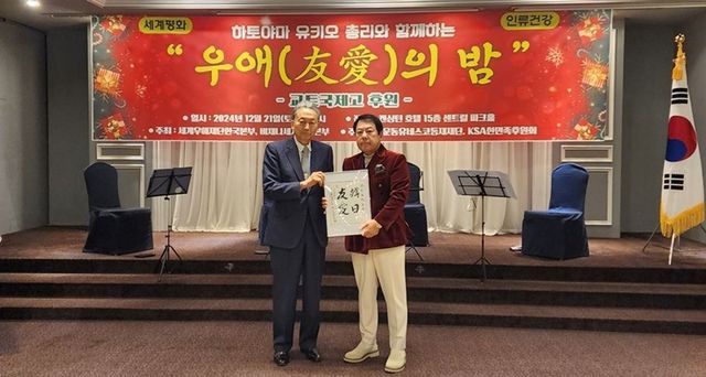 [전국=위키트리 최학봉 선임기자] 아이넷방송 박준희 회장은 21일(토) 오후 서울시 여의도 켄싱턴호텔 센트럴 파크홀에서 개최된 하토야마 유키오 총리와 함께 하는 우애의 밤 행사에 참석하여 일본의 엔카와 대한민국 트로트 음악 교류를 통해 한국과 일본의 우호증진과 미래 발전에 기여한 하토야마 유키오 일본 제93대 총리께 박준희 회장은 한민족감사패와 메달을 시상했다.