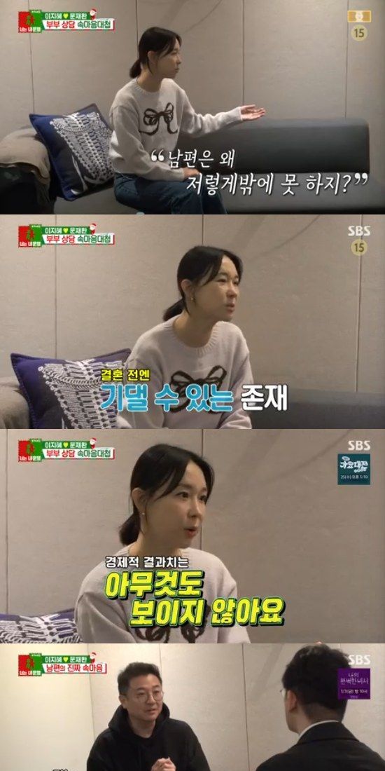 이지혜는 의사 앞에서 "남펴이 성에 안 찬다. '왜 저렇게 밖에 못하지?' 이런 생각이 든다. 남편이 뭘 하면 뒷수습을 내가 다 해야한다. 예전에는 기댈 수 있는 존재였는데, 이제는 내가 챙겨야할 존재"라고 속내를 드러냈다.