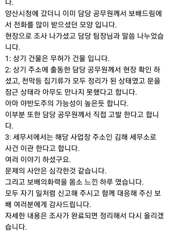 양산시 공무원이 신고 받고 확인하러 가니까 그새 낌새를 눈치채고 야반도주함