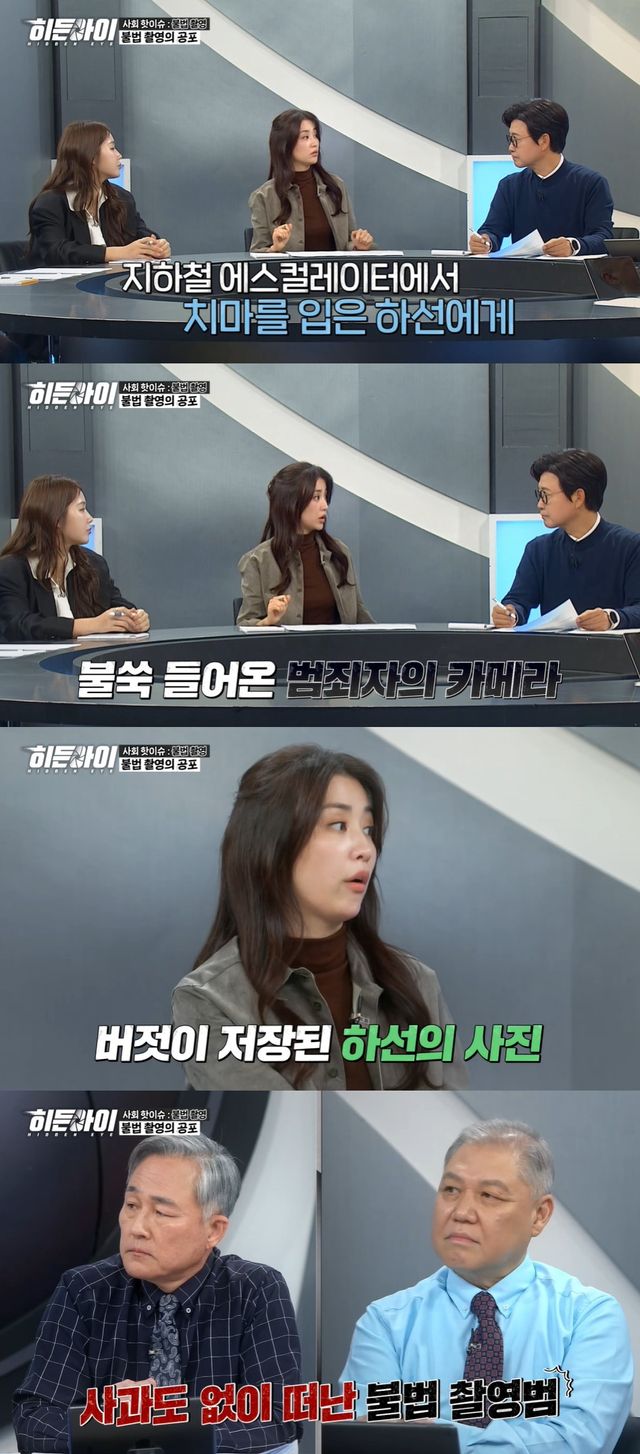 23일 방송된 MBC 에브리원 '히든아이'에서는 불법 촬영 사건이 공개되며 박하선이 대학생 때 지하철에서 불법 촬영을 당한 경험을 털어놓는 모습이 전파를 탔다.
