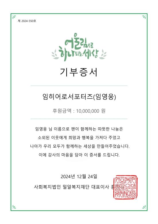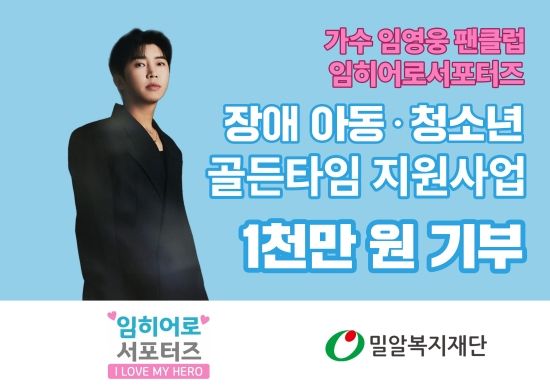 최근 밀알복지재단(이사장 홍정길)은 임영웅 팬클럽 '임히어로서포터즈'로부터 1천만 원을 전달받았다고 밝혔다.