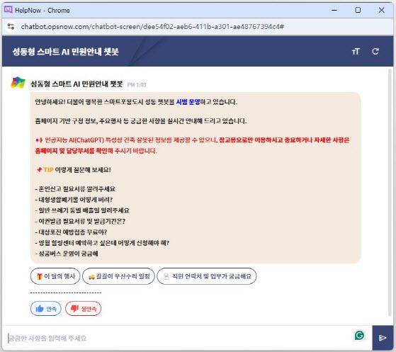 최근 시범 운영을 시작한 성동형 스마트 AI 민원 안내 챗봇은 생성형 AI를 활용한 대화형 AI 서비스다. 신속한 민원 대응을 통해 구민의 편의성과 만족도를 높이는 것에 중점을 둔다. 교통, 행정, 복지, 환경, 안전, 문화 등 10대 핵심 분야의 관련 정보를 순차적으로 서비스화해 24시간 365일 최적의 답변을 제공할 계획이다. 단순 안내 업무를 챗봇이 대체함으로써 공무원의 업무 효율성이 크게 향상될 것으로 기대하고 있다.