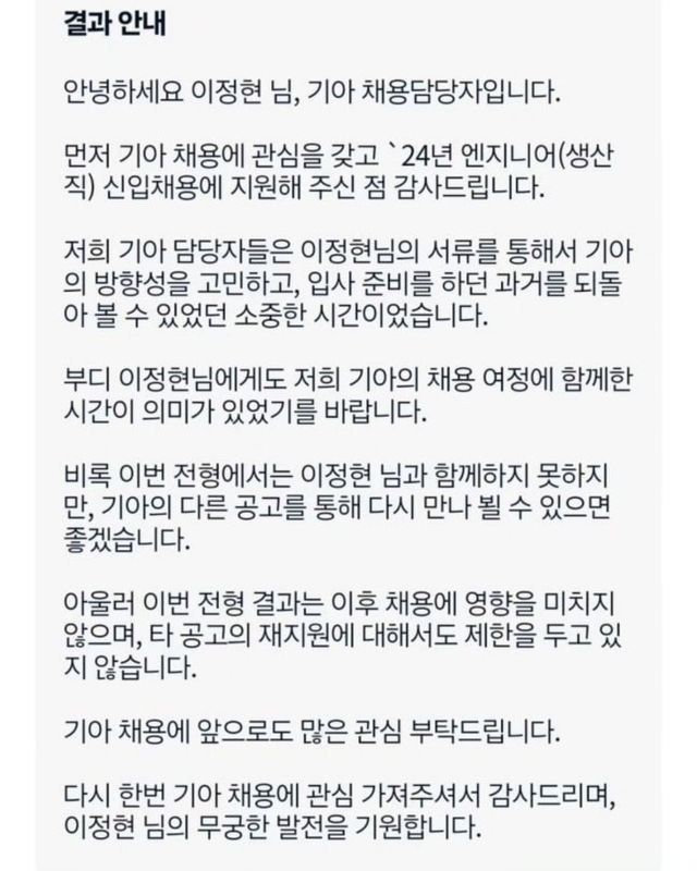 기아 채용 담당자는 이정현에게 1차 탈락을 알리며 “저희 기아 담당자들은 이정현 님의 서류를 통해 기아의 방향성을 고민하고 입사 준비를 하던 과거를 되돌아볼 수 있었던 소중한 시간이었다”며 “부디 이정현 님에게도 저희 기아의 채용 여정에 함께한 시간이 의미가 있었기를 바란다”고 밝혔다.