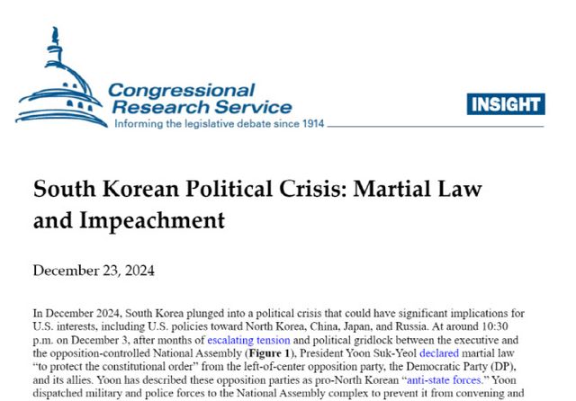 비당파적 조직으로 미국 의회에 각종 정보를 제공하는 의회조사국은 23일(현지시간) “한국의 정치적 위기: 계엄과 탄핵”이라는 제목의 보고서를 발간했다.