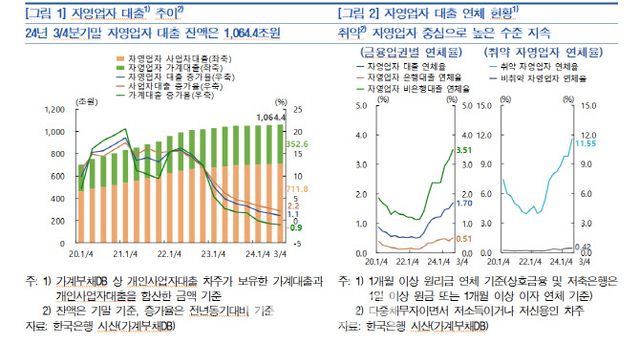 24일 한국은행이 발간한 ‘하반기 금융안정보고서’에 따르면 자영업자 대출 연체율은 비은행권 및 취약차주를 중심으로 높은 수준을 이어가고 있다. 3분기 말 자영업자 대출 연체율은 1.7%로 상승세를 지속하는 가운데, 취약 자영업자의 대출 연체율은 11.55%로, 비취약 자영업자(0.42%)와 큰 격차를 보였다. 업권별로는 자영업자의 비은행권 대출 연체율이 3.51%로 큰 폭 상승해 은행권 대출 연체율(0.51%)을 상당폭 상회했다.