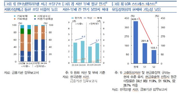 또 인터넷은행의 자산·부채 간 만기 불일치 정도는 3.4년으로 시중은행(3.8년)에 비해 다소 낮다. 다만 만기 불일치 정도가 지난해 3분기말 2.8년에서 1년 만에 0.6년 늘어나는 등 시중은행(3.5년→3.8년)에 비해 상대적으로 빠른 속도로 확대되고 있는 점에 유의할 필요가 있는데, 이는 대출자산의 평균만기가 주택담보대출 취급 확대 등으로 길어진 데 주로 기인한다는 게 한은 측 설명이다.