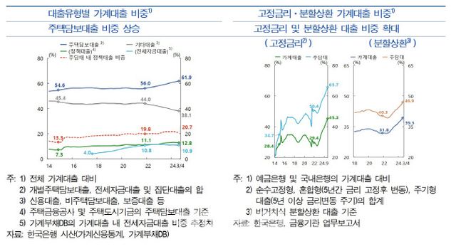 2021년 말과 올해 3분기 말을 비교하면 대출유형별로는 주택담보대출의 비중이 56%에서 61.9%로 늘었고, 금리조건별·상환방식별로는 고정금리(29.4%→ 45.3%)와 분할상환(31.8% → 39.3%) 대출 비중이 상승했다.