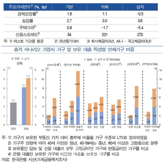 또 성장률 하락, 실업률 증가, 주택가격 하락 등 거시경제 충격으로 가계소득이 감소하고 자산가격이 하락하는 시나리오를 가정해 가계의 대출상환 리스크를 추정한 결과, 2026년 기준 차입 가구 중 연체가구 비중은 2023년에 비해 최대 2배 상승하는 것으로 추정됐다.