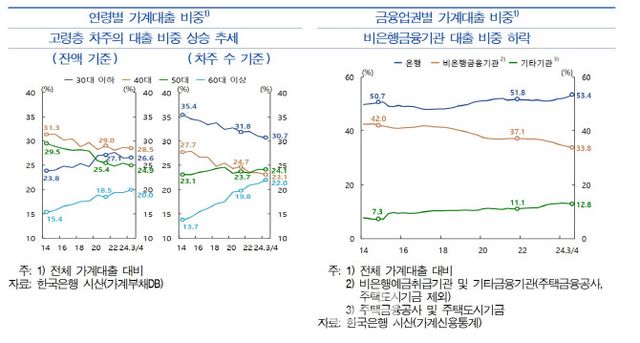 차주 연령별 대출 비중(잔액기준)에서는 팬데믹 기간을 거치는 동안 주택 구입을 늘린 30대 이하기 50대를 추월했다. 금융업권별로는 비은행금융기관 대출 비중이 2021년 말 37.1%에서 2024년 3분기 말 33.8%로 하락했다.