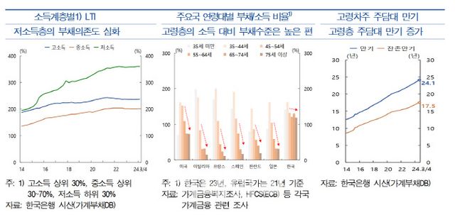 한국은행은 24일 발간한 ‘하반기 금융안정보고서’에서 가계부채의 잠재 리스크를 금융·경제의 취약성 측면에서 살펴본 결과 “저소득층의 부채의존도가 중·고소득층에 비해 크게 확대됨에 따라 소비제약이 심화할 수 있으며, 고령층의 소득 대비 부채 수준은 주요국과 비교하여 높은 편”이라고 진단했다.