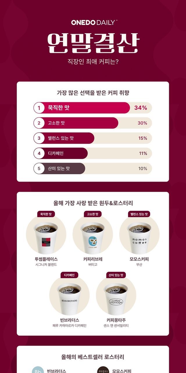 원두데일리에 입점한 로스터리 제품 중 커피 취향별로 고객의 선택을 가장 많이 받은 원두는 다음과 같다. 묵직한 맛은 △투썸플레이스 ‘시그니처 블렌드’, 밸런스 있는 맛은 △모모스커피 ‘부산’, 고소한 맛은 △커피리브레 ‘버티고’, 산미 있는 맛은 △커피몽타주 ‘센스앤 센서빌리티’, 디카페인은 △빈브라더스 ‘페루 카하마르카 디카페인’으로 나타났다.