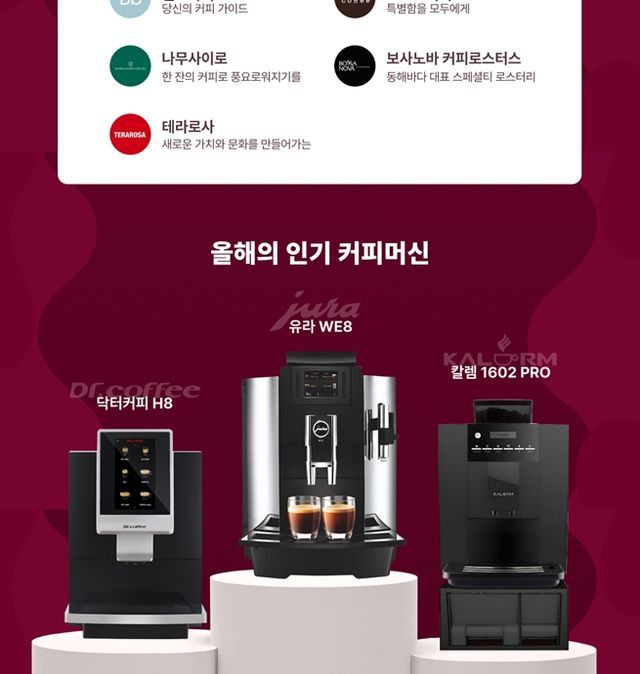 또한, 올해 가장 인기 있는 베스트셀러 로스터리는 빈브라더스, 모모스커피, 나무사이로, 보사노바, 테라로사가 선정되었다. 커피머신 분야에서는 원두데일리의 독점 공급 모델인 스위스 명품 커피머신 유라의 WE8이 가장 선호하는 커피머신으로 꼽혔다. 이외에도 소형 머신으로는 칼렘 1602와 닥터커피 H8 모델이 상위권에 자리했으며, 고객들이 가장 선호하는 고사양 머신에서는 칼렘 X650과 유라 GIGA8, 프랑케 A400 머신이 고객들이 순차적으로 꼽혔다.