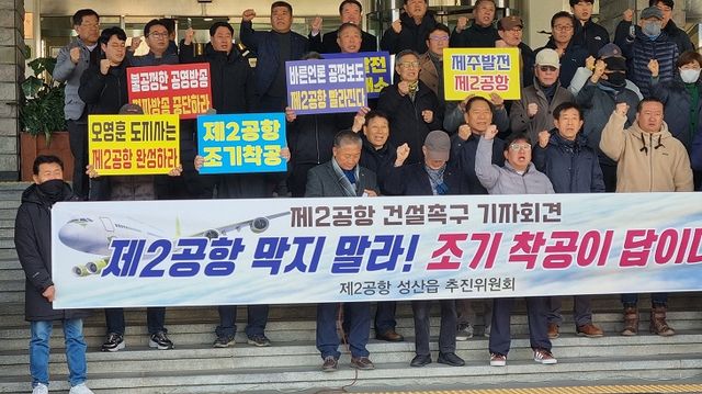 제주 제2공항 성산읍추진위원회는 24일 제주도청 현관 앞에서 기자회견을 열어 "제2공항(건설사업)은 정부 발표 이후 온갖 반대에 발목을 잡혀 9년을 허비했다"며 이같이 주장했다.