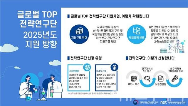 과학기술정보통신부는 국가과학기술연구회(NST)와 ‘글로벌 TOP 전략연구단’ 2025년도 신규 선정을 위한 제안서 공고 및 접수를 실시한다고 밝혔다.