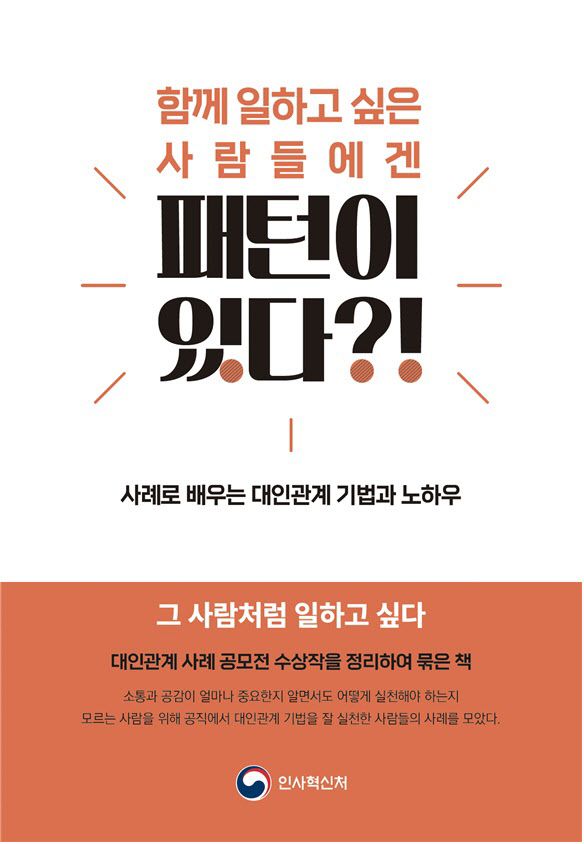 [세종=이데일리 서대웅 기자] 인사혁신처는 건강한 공직문화 조성을 위해 대인관계 사례집 ‘함께 일하고 싶은 사람들에겐 패턴이 있다?!’를 발간했다고 24일 밝혔다.
