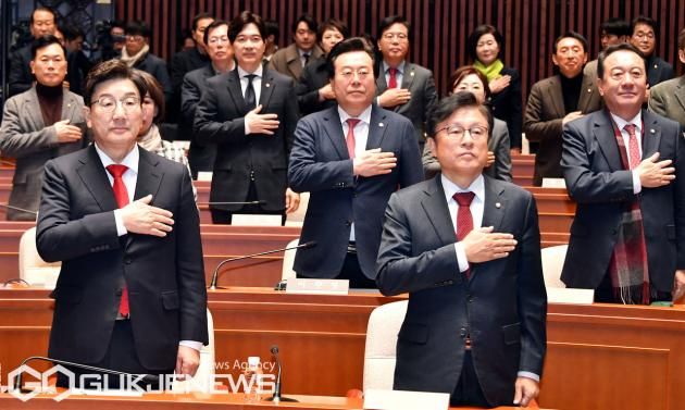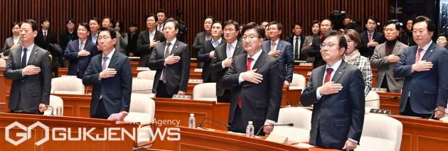 (서울=국제뉴스) 권성동 국민의힘 대표 권한대행 겸 원내대표가 24일 오전 서울 여의도 국회에서 열린 의원총회에서 의원들과 국민의례를 하고 있다./사진=이용우기자