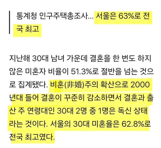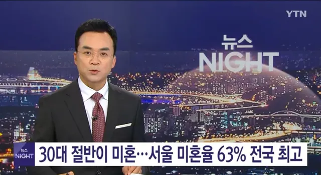 서울 거주하는 30대의 63%가 미혼, 전국최고