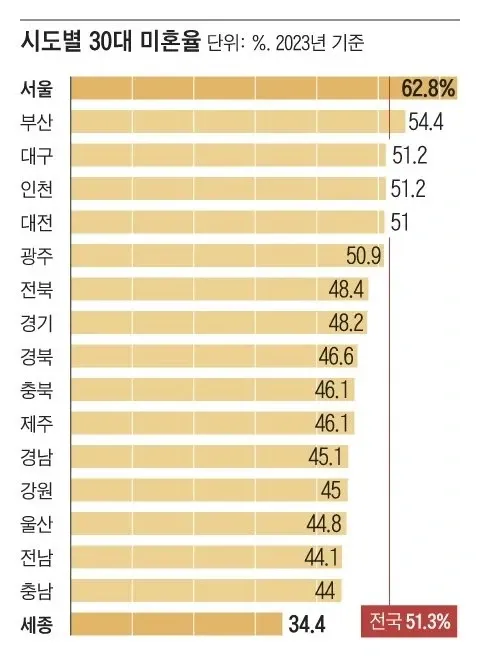 ‘30대(30-39세)‘ 미혼율 전국 평균 51.3%