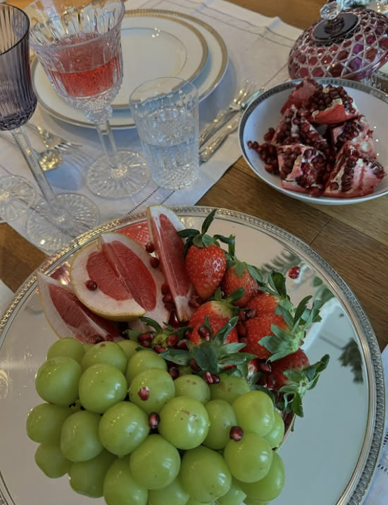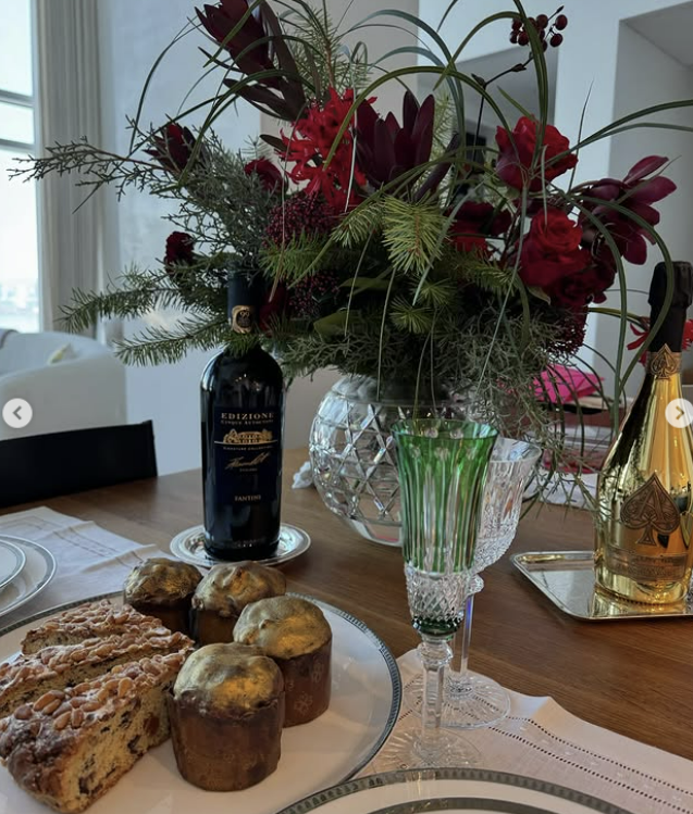크리스마스 이브를 맞아 그가 준비한 파티 다과도 눈길을 끈다. 석류, 샤인머스켓을 비롯한 과일과 호두파이, 샴페인 등 풍성하게 차려졌다.