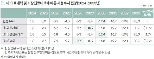 보고서는 의료개혁과 비상진료체계에 건강보험 재정이 투입되지 않는 경우 건보 재정은 2026년 5000억원 적자로 전환하며 2030년 누적 준비금이 소진될 것으로 내다봤다. 만약 두 과제에 대한 건보 재정 투자가 진행되면 적자는 1년, 누적 준비금 소진은 2년 빨라진다. 향후 10년간 누적적자액은 두 정책에 대해 건보 재정을 투입하지 않았을 때보다 32.2조원 증가한다.