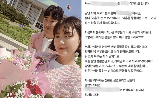 공개된 문자 대화 속 자신을 작가라고 밝힌 이는 “절대 이혼하는 프로가 아니고 이혼을 종용하는 프로도 아니라는 점 먼저 말씀드린다”며 “지금까지 본의 아니게 센 부부들이 나와 수위가 세다보니 그렇게 느끼시는 분들이 많아 미리 말씀드려요”라면서 출연을 요청했다.