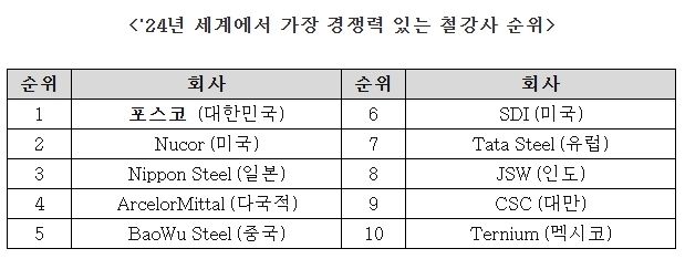 24일 철강업계에 따르면 세계적인 철강 전문 분석 기관인 WSD(World Steel Dynamics)는 지난 22일(뉴욕 현지시간) '2024년 세계에서 가장 경쟁력 있는 철강사(World-Class Steelmaker Rankings) 선정 결과를 발표했다.