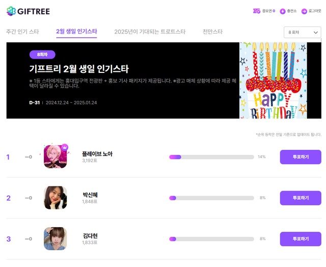 2월이 생일인 후보자로는 플레이브 노아, 박신혜, 김다현, TXT(투모로우바이투게더) 태현, 에녹, 크래비티 정모, 엔믹스 해원, 세븐틴 도겸, 엔시티(NCT) 도영, 스트레이키즈 아이엔, 트와이스 지효, BTS(방탄소년단) 제이홉, 엔하이픈 정원, 더보이즈 케빈, 김민주, 레드벨벳 슬기 등으로 배우, 트로트 가수, 솔로 가수 등 다양한 분야의 스타들이 선정됐다.