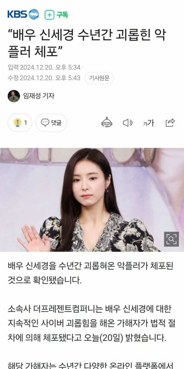 배우 신세경 수년간 괴롭힌 악플러 체포,,