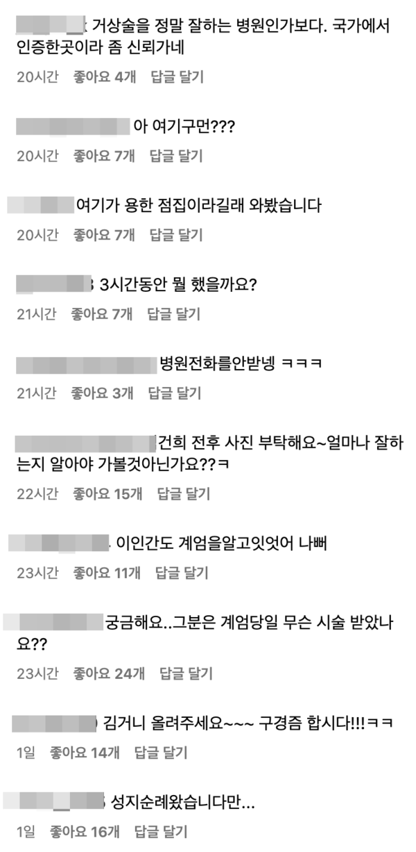 김 여사의 성형외과 방문 사실이 알려지자, 해당 병원은 온라인에서 비난 댓글과 별점 테러의 대상이 됐다. 네티즌들은 “계엄 당일에도 시술이 가능한 병원이냐”, “3시간 동안 무엇을 했는지 밝혀라” 등의 댓글을 남기며 병원을 비판했다.