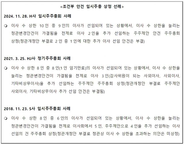 하지만 법조계는 해당 주주(유미개발)가 정관 변경의 안건을 6주 전인 12월 10일 제안했고, 여러 선례를 보면 정관 변경을 전제로 한 주주 제안도 충분히 가능하기에 절차상 문제가 없다고 보는 시각이 우세하다. 또 주총에서 정관 변경이 가결되는 것을 전제로, 변경된 정관에 따른 주주제안을 사전에 하는 것(정지 조건부 주주제안)도 가능하다고 본다. 주총에서 정관이 변경되면 즉시 효력이 발생하기 때문이다.