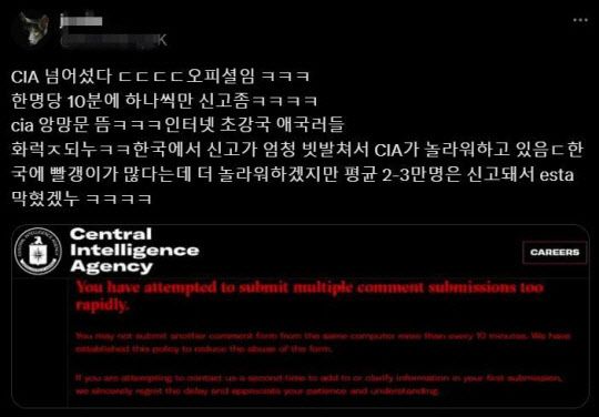 A씨는 “CIA 사과문이 떴다. 한국에서 신고가 엄청나게 빗발쳐서 CIA가 놀라워하고 있음. 인터넷 초강국 애국자들의 화력이 대단하다”며 “평균 2만~3만명은 신고돼서 ESTA(전자여행허가제) 발급이 막혔을 것”이라고 주장했다.