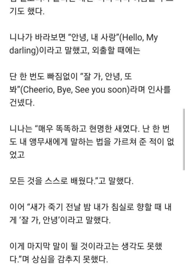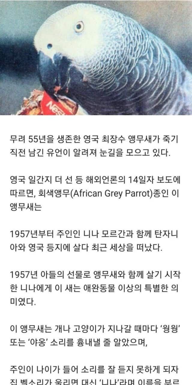 55년 긴 생을 마감한 앵무새의 마지막 말