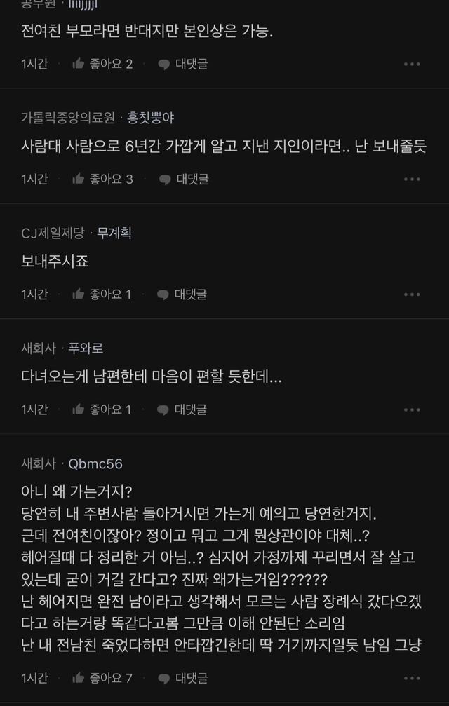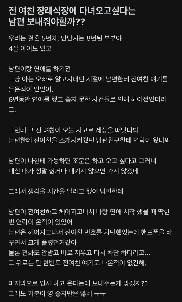 전 여친 장례식장에 다녀오고 싶다는 남편. 보내줘야할까?