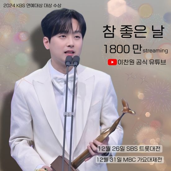 한편, 이찬원은 지난 21일 개최된 '2024 KBS 연예대상'에서 대상을 받았다. 그는 오는 26일 개최되는 'SBS 트롯대전'에 출연한다.