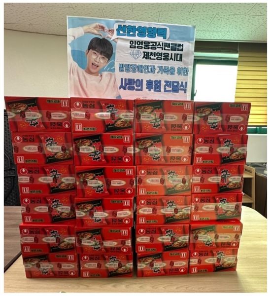 임영웅 팬클럽 '영웅시대 제천'은 지난 23일 제천시장애인부모연대를 찾아 50만 원 상당의 라면을 기부했다고 밝혔다.