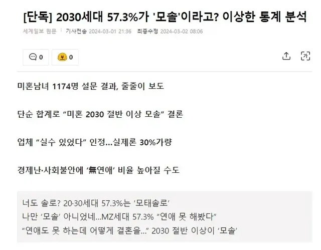 30대 응답자 21.9%가 모솔이라고 했는데