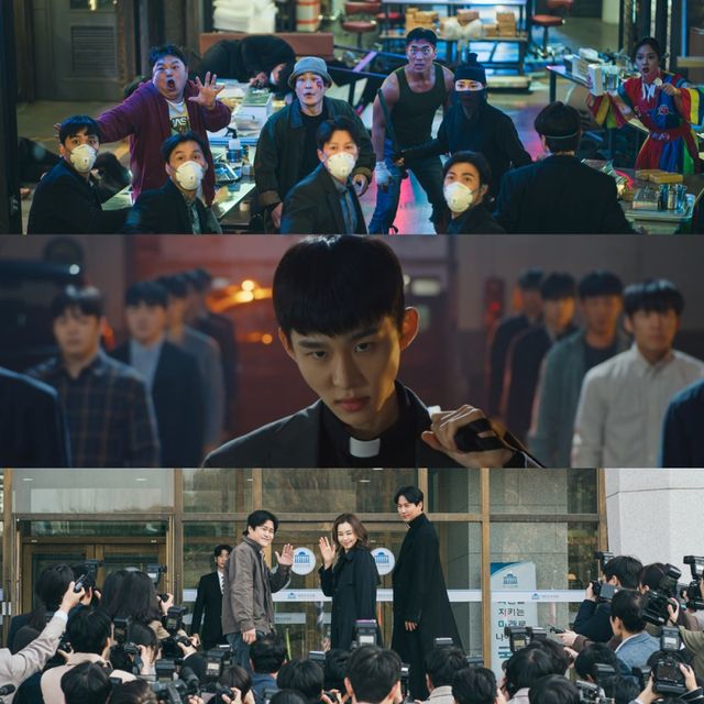 마지막 ‘도파민 폭발’ 명장면은 11회 엔딩이었던 김해일, 박경선, 구대영의 ‘꿀단지 청문회 입성 1초 전’ 장면이다. 세 사람은 김홍식의 인터폴 적색수배 현장에서 일어난 갑작스러운 사고로 인해 빌런인 김홍식과 남두헌(서현우)를 동시에 놓쳐 허탈함을 감추지 못했다. 더불어 놓쳤던 빌런 중 하나인 남두헌이 그동안 모은 꿀단지로 고위층들을 협박해 중앙지검 특수2부장으로 갔다는 것을 알게 된 후 격분했다. 결국 위험천만하지만, 정의를 수호하기로 결심한 김해일과 박경선은 마약조직과의 결탁 및 살인 교사, 고위층 자녀의 마약 범죄 축소 수사 혐의로 중앙지검 SDH 남두헌 부장검사를 검찰에 고발했고, 이는 뉴스에 보도되며 ‘꿀단지 게이트’라는 별칭을 얻어 청문회까지 열렸다. 이어 박경선과 구대영, 김해일이 기자들을 가로지르며 청문회로 향하는 ‘위풍당당 청문회 입장’ 장면이 사이다 반격을 예고하며 호기심을 모았다.