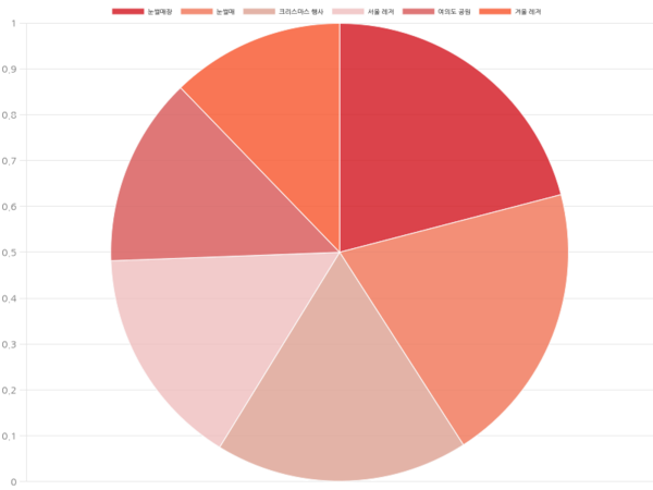 크리스마스 행사는 검색 트렌드 지수 600 포인트를 기록하며, 크리스마스 분위기를 즐기고자 하는 시민들의 관심을 반영했다. 이와 함께 서울 레저, 여의도 공원, 겨울 레저 등의 키워드도 각각 주목받았으나, 지표 상 비교적 낮은 수치를 보였다.
