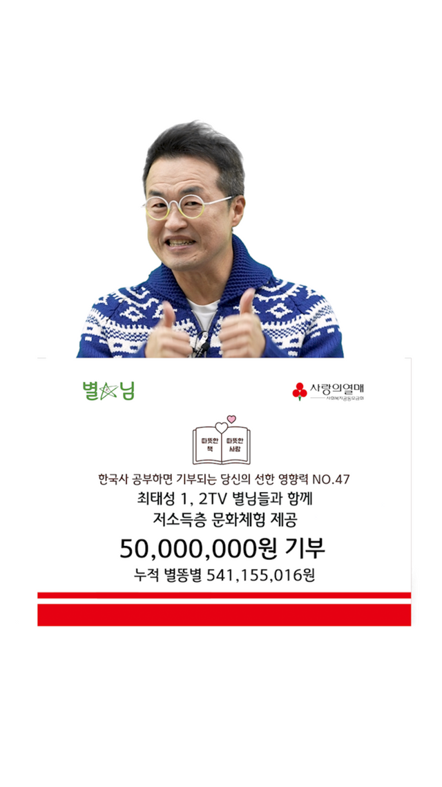 별별한국사 대표이기도 한큰별쌤 최태성은 이미 2021년 12월부터 사랑의열매 고액 기부자 모임인 ‘아너소사이어티’의 회원으로, 그리고 2022년 3월부터는 사랑의열매 홍보대사로 활동하며 지속적인 나눔을 실천해왔다. 특히 2023년에는 발달장애인들의 자립을 돕고자 직업재활시설에 2600만 원 상당의 1톤 냉동 탑차를 기증하기도 했다.