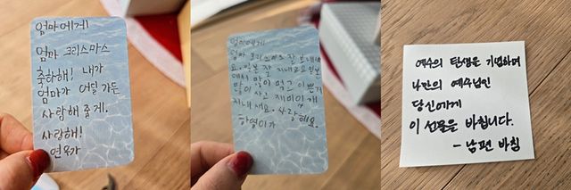연우가 쓴 편지에는 "내가 엄마가 어딜 가든 사랑해 줄게"라는 문구가 담겨있고, 하영이는 "많이 먹고, 예쁜거 많이 사고 재미있게 지내세요"라는 진심을 전했다. 도경완은 "나만의 예수님인 당신에게 이 선물을 바칩니다"라고 적어 웃음을 자아냈다.