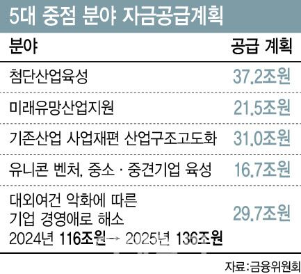 4개 정책금융기관은 내년에 247조 5000억원의 정책금융을 공급할 계획이다. 특히 부처가 공동으로 선정한 5대 중점 전략분야 대해서는 올해 계획이었던 116조원과 비교해 20조원 증가한 136조원의 자금을 공급한다. 산업변화·사업수요를 반영해 인공지능·태양전지 등을 주요부문에 신설하고 석유화학산업 등 경쟁력 강화가 필요한 산업도 별도 관리한다. 내년에는 연 2%대 국고채 수준의 초저리로 제공하는 반도체 분야 저리설비투자대출 4조 2500억원을 가동하며 반도체생태계펀드 등 소부장 경쟁력 강화를 위한 투자자금도 확대한다.